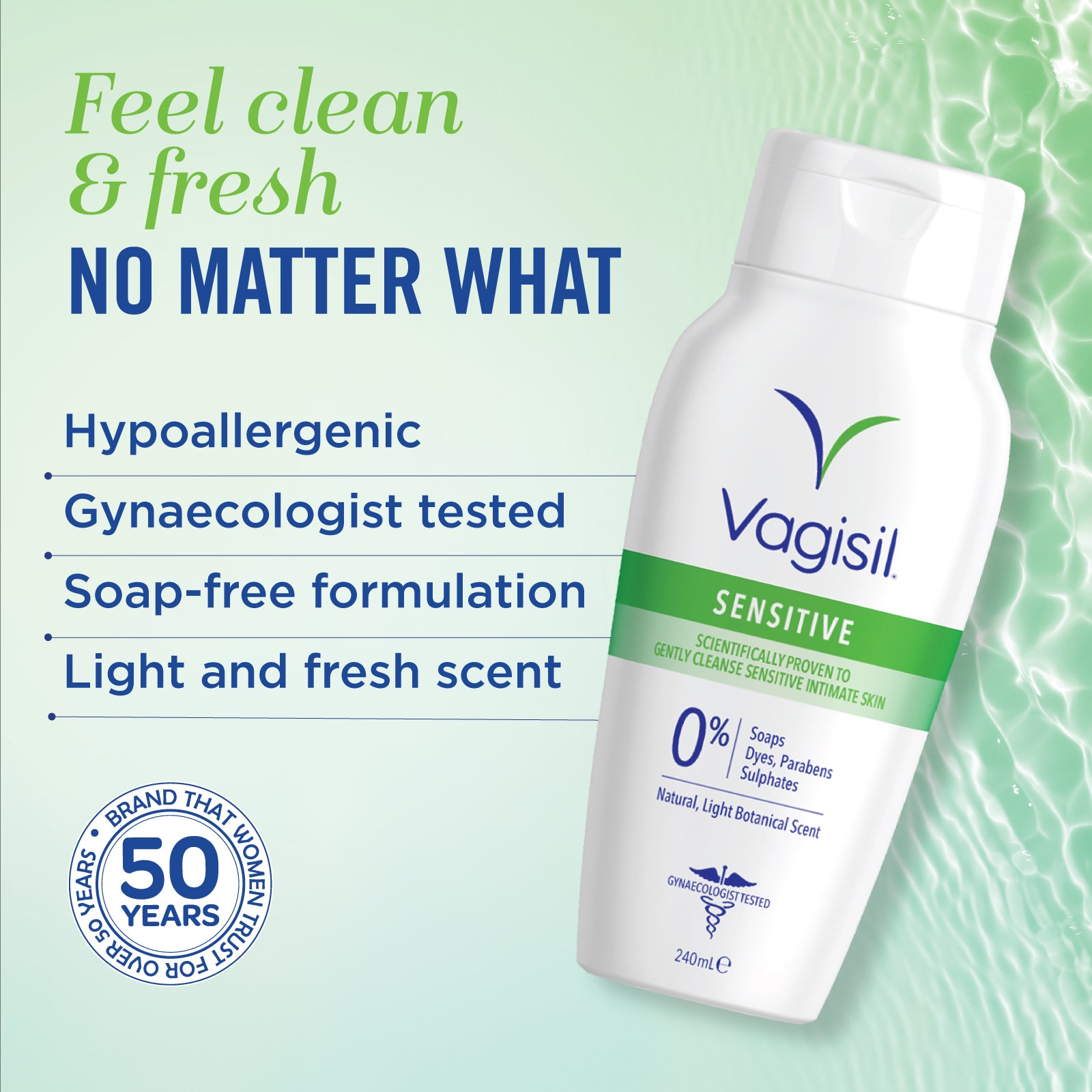 8.9 out of 10 adult women who shop for feminine care products find it important to have products made specifically for sensitive skin. Vagisil® Sensitive Daily Intimate Wash is the gentlest within Vagisil® range of feminine wash. It contains no sulphates (including SLS), parabens, soap and dyes. It is scientifically proven to gently cleanse and protect the most sensitive intimate skin.